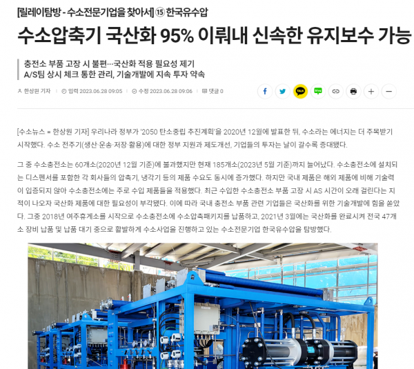 기사소개 (H2 NEWS 수소압축기 국산화 95% 이뤄내 신속한 유지보수 가능)